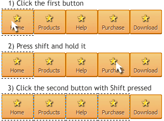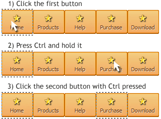 Button creator - work areaThis is where your menu is previewed. All changes are instantly displayed. Also, you can test how the buttons web respond to the mouse events. Just act like it is a web page: move mouse over the buttons, click them and so on to preview. Left-click a button to select. If you want several buttons web to be selected use Shift and Ctrl keys. Use Shift to select several adjacent buttons. Click first button to be selected, then press Shift and while holding it pressed click the second button. This two buttons and the buttons that lay between them will be selected