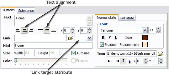 Text offset - text offset in relative coordinates. For more precise text position adjustment. Link - the link that is to be opened when user clicks the button. For example: http://www.vista-buttons.com. You can also click "Open" icon to the left of the "Link" field to select the page you want to link to. Link target attribute - link behavior adjustment. Link target attribute tells web-browser where to open the linked page. This attribute represents the Target attribute of the link (<a> tag in HTML). You can either enter your target value in the field or choose from the predefined attribute values in the list. If you enter your own value, it must be a window or a frame name. Note, that names are case-sensitive. The linked document will then be opened in that window/frame. Predefined attribute values: Hint - specifies the tooltip that is shown when you hold the mouse over the button for a few seconds. Autosize - defines whether the button size is set automatically to accommodate all its contents or not. If not, you should enter the button size manually in the "Width" and "Height" fields. Width, Height - if "Autosize" property is off then you can enter the button size in these fields. Pressed - this property is disabled unless your menu type is "3-state toggle". If the menu type is "3-state toggle" and the property is set then the button will be displayed as pressed. Note, that only one button in the menu can be "pressed" at a time. In the example below, the "Download" web page buttons Pressed property is set.